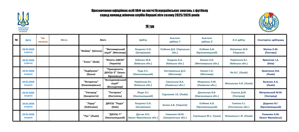 Комітети Української асоціації футболу призначили офіційних осіб на матчі 10-го туру Чемпіонату України серед жіночих клубів Першої ліги сезону 2025/2026 рр.
